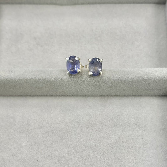 Sidabriniai rodžiuoti kabantys auskarai su mėlynu cirkoniu