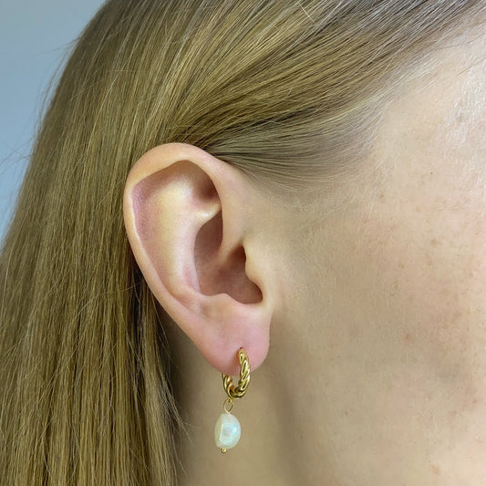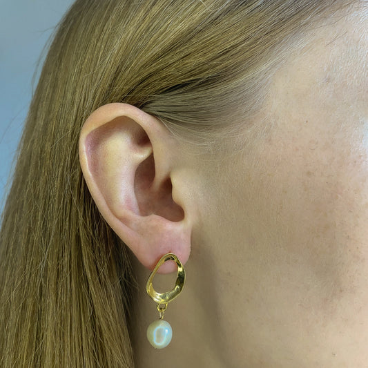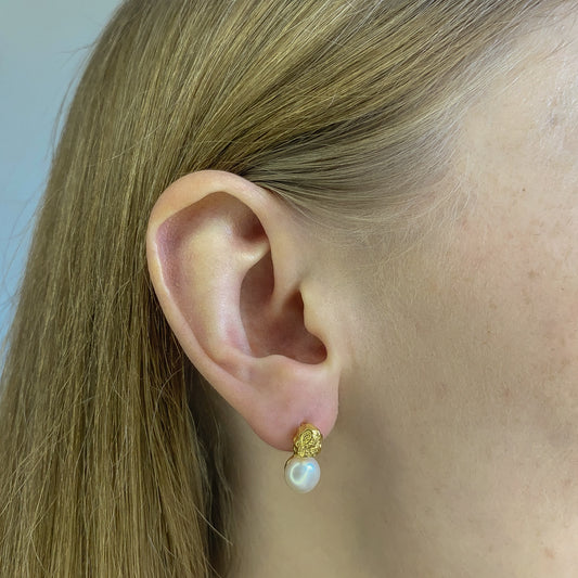 Sidabriniai auksuoti kabantys auskarai su perlu