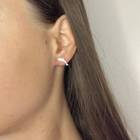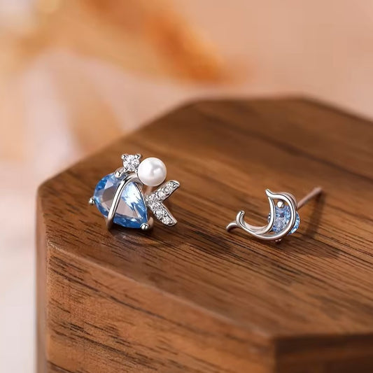 Sidabriniai rodžiuoti auskarai su žydru cirkoniu ir delfinu