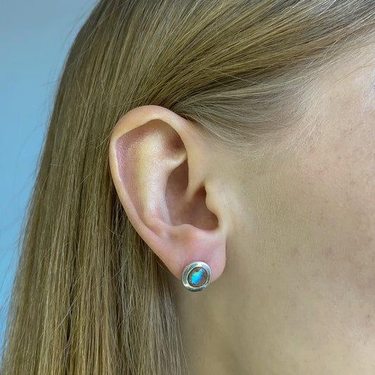 IšparduotaSidabriniai auskarai su apvaliu labradoritu
