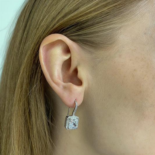 Sidabriniai rodžiuoti kabantys auskarai su kvadrato formos cirkoniu
