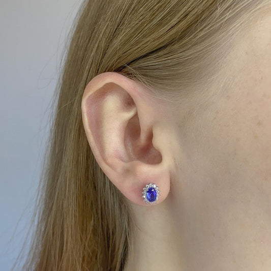 Sidabriniai rodžiuoti auskarai su ovaliu mėlynu cirkoniu