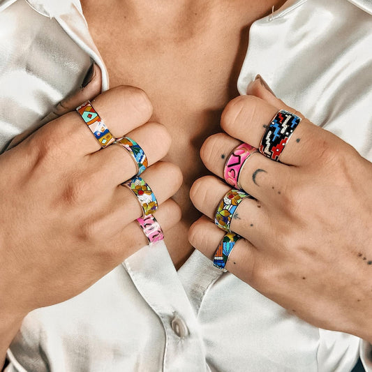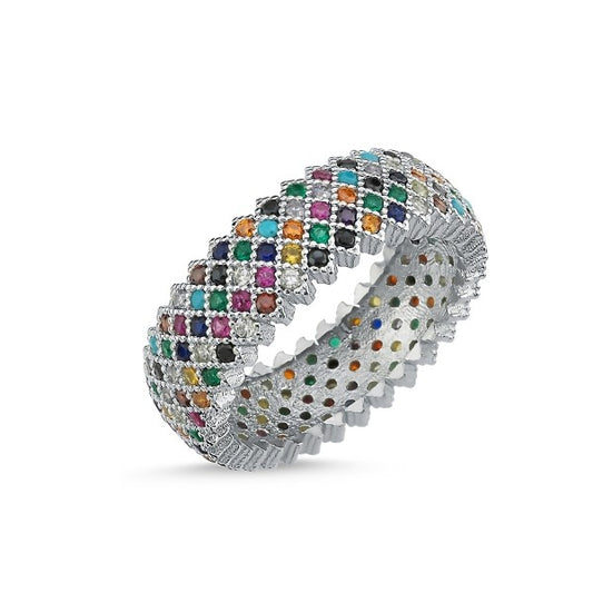 Sidabrinis rodžiuotas žiedas su 5 spalvotų cirkonių eilėmis