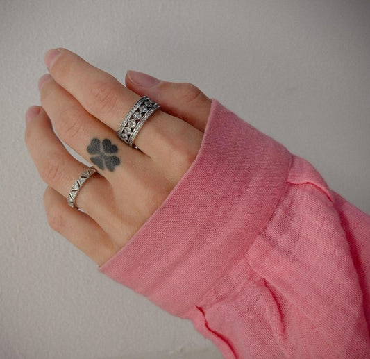 Sidabrinis rodžiuotas platus žiedas su cirkoniais