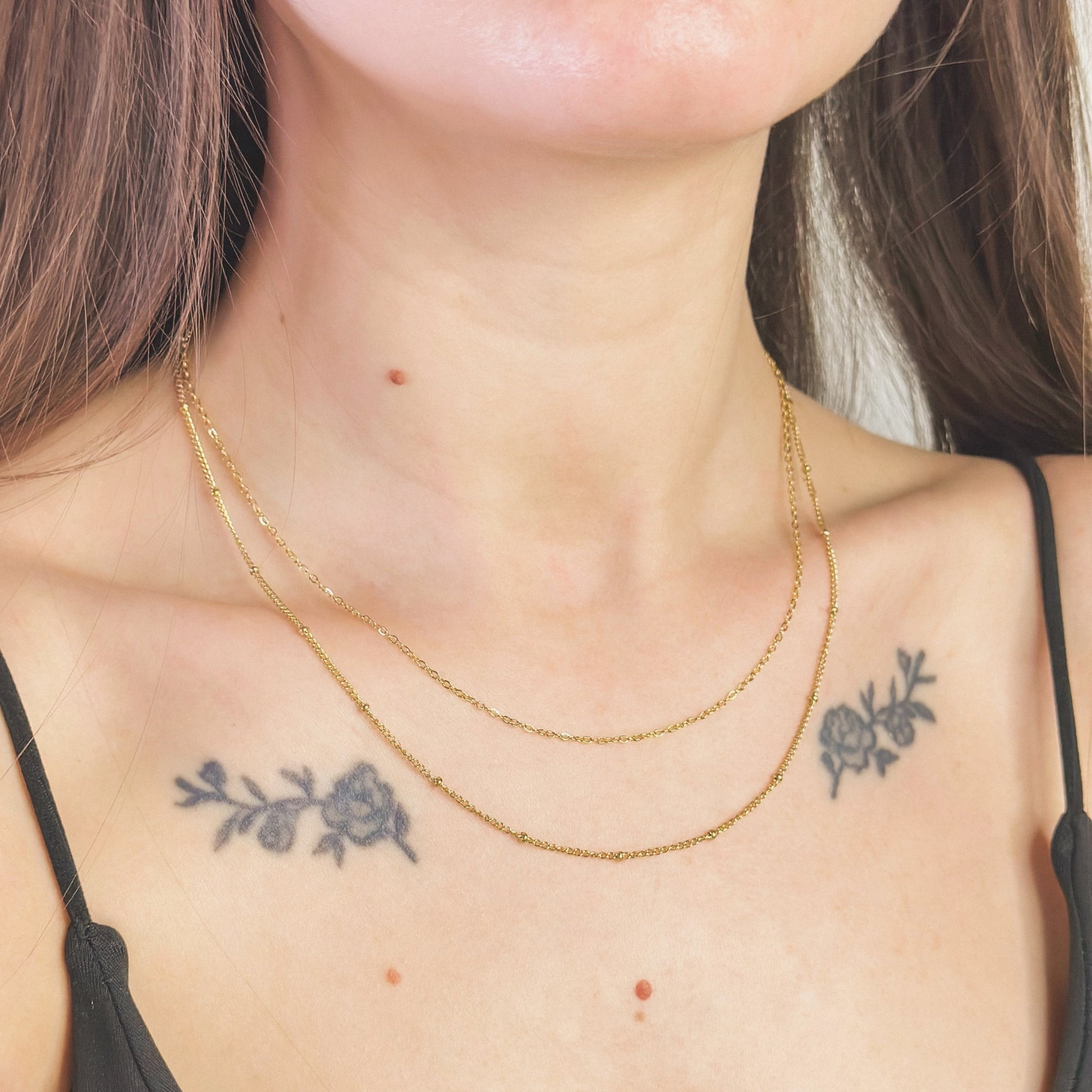 Sujungtos dvi skirtingo ilgio grandinėlės, kurios kartu sukuria stilingą sluoksniuotą efektą.