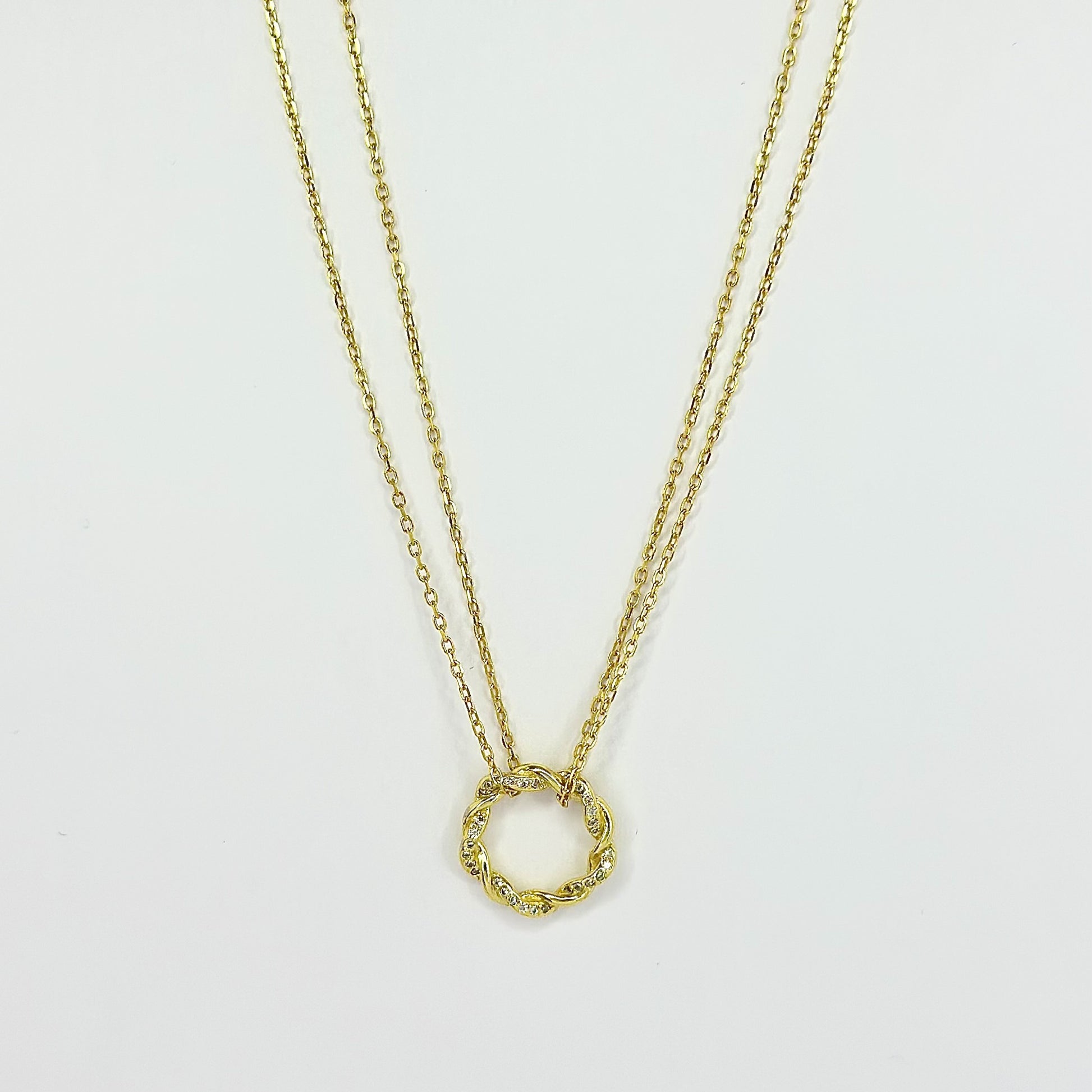 Sidabrinis auksuotas apvalus pakabukas su cirkoniais ir dviejų gijų grandinėlė