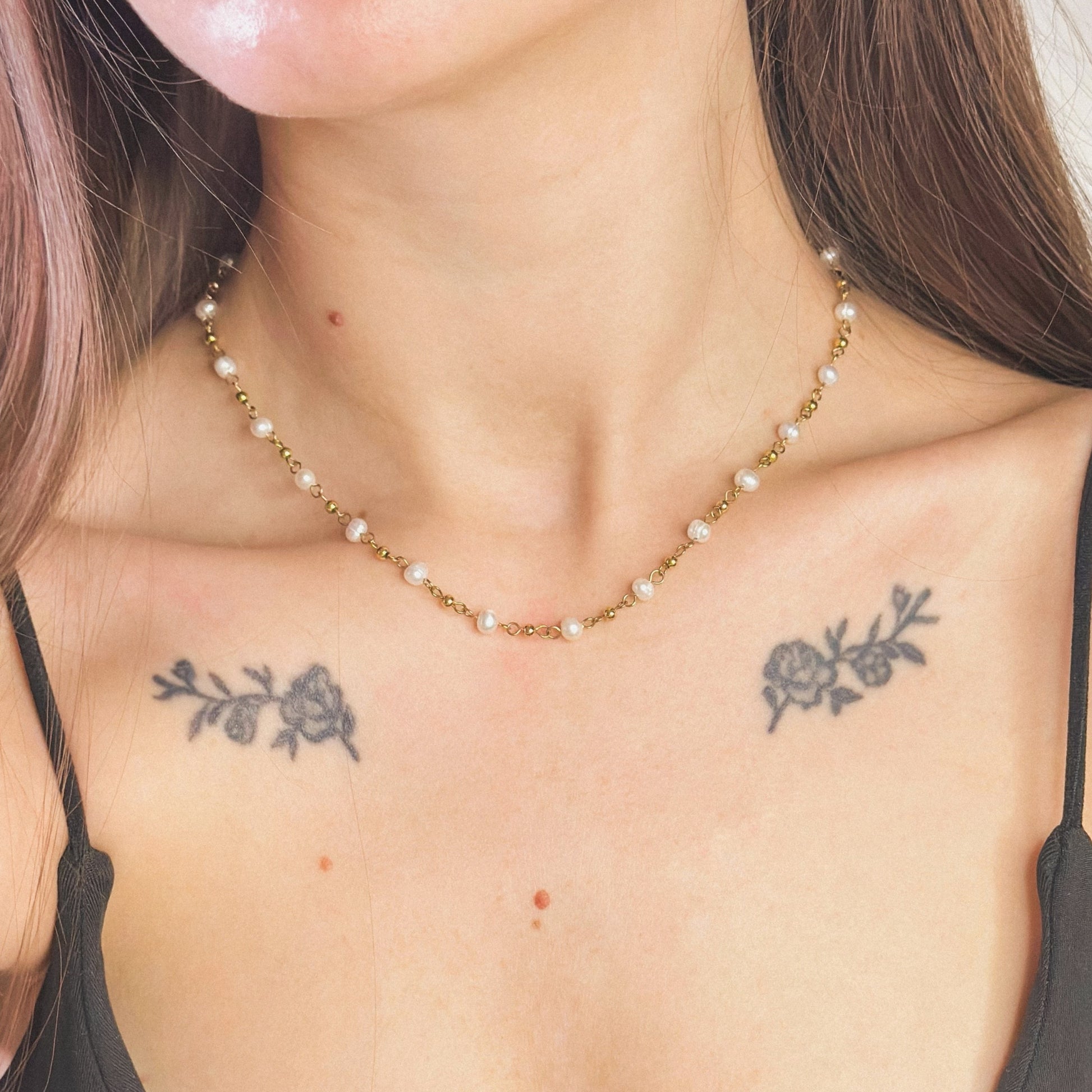 Perliukų dydis: 4 -5 mm. Kadangi perlas natūralus, gali pasitaikyti netaisyklingos formos.