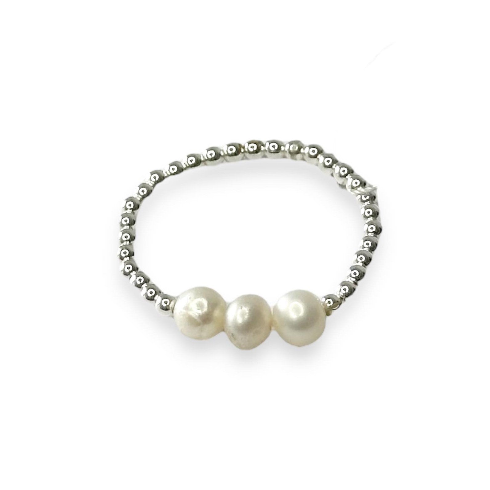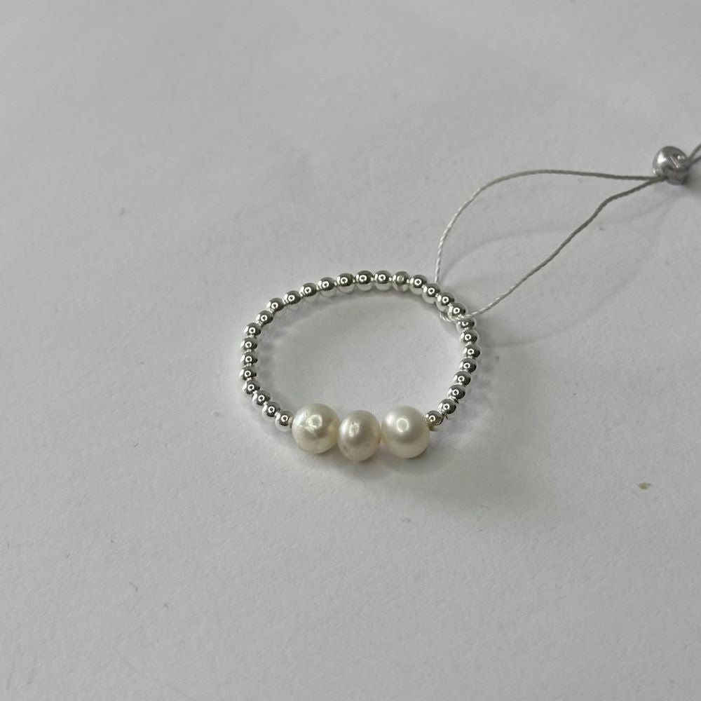 Žiedas suvertas iš sidabro karoliukų ir tikrų kultivuotų 4-5mm gėlavandenių perliukų.
