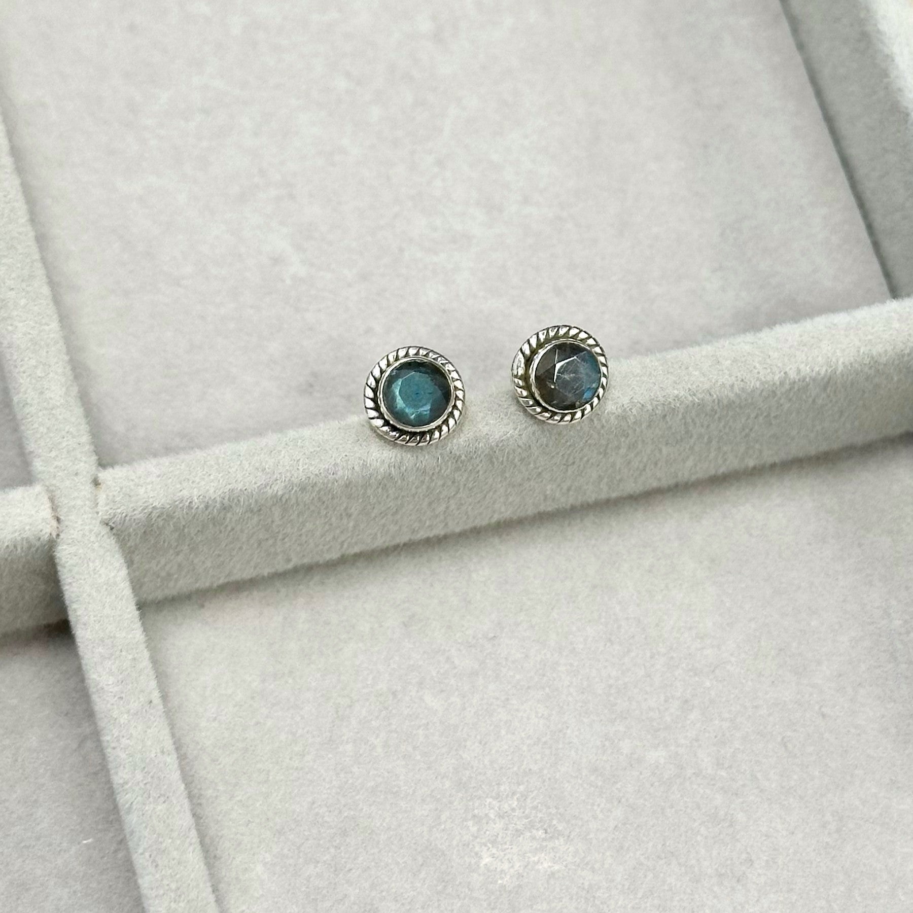 Sidabriniai apvalūs auskarai su labradorito akmeniu