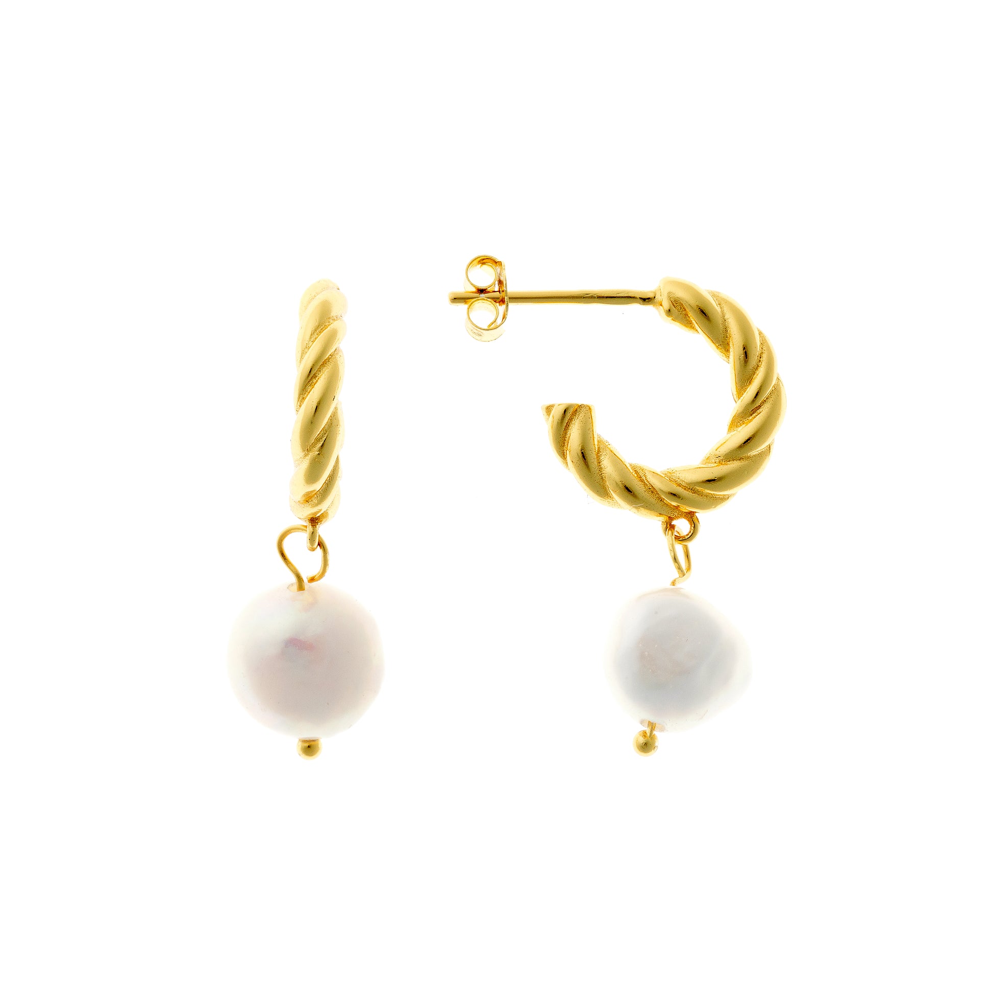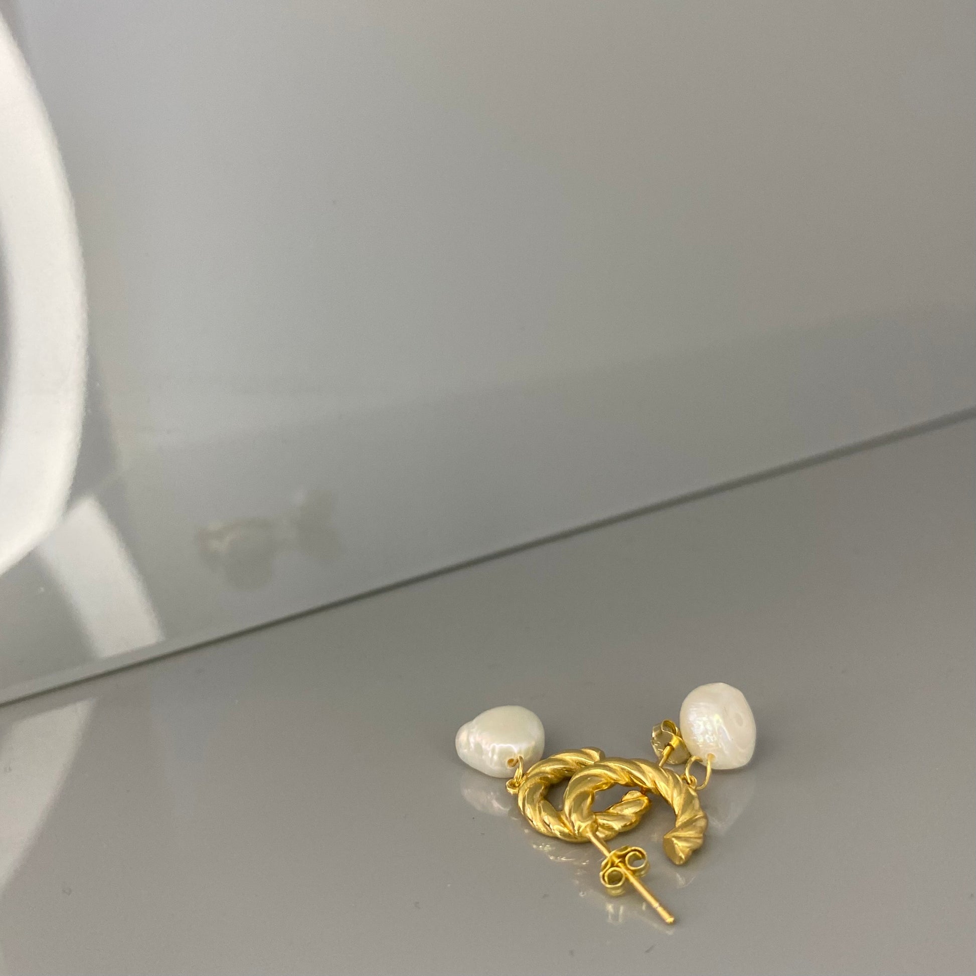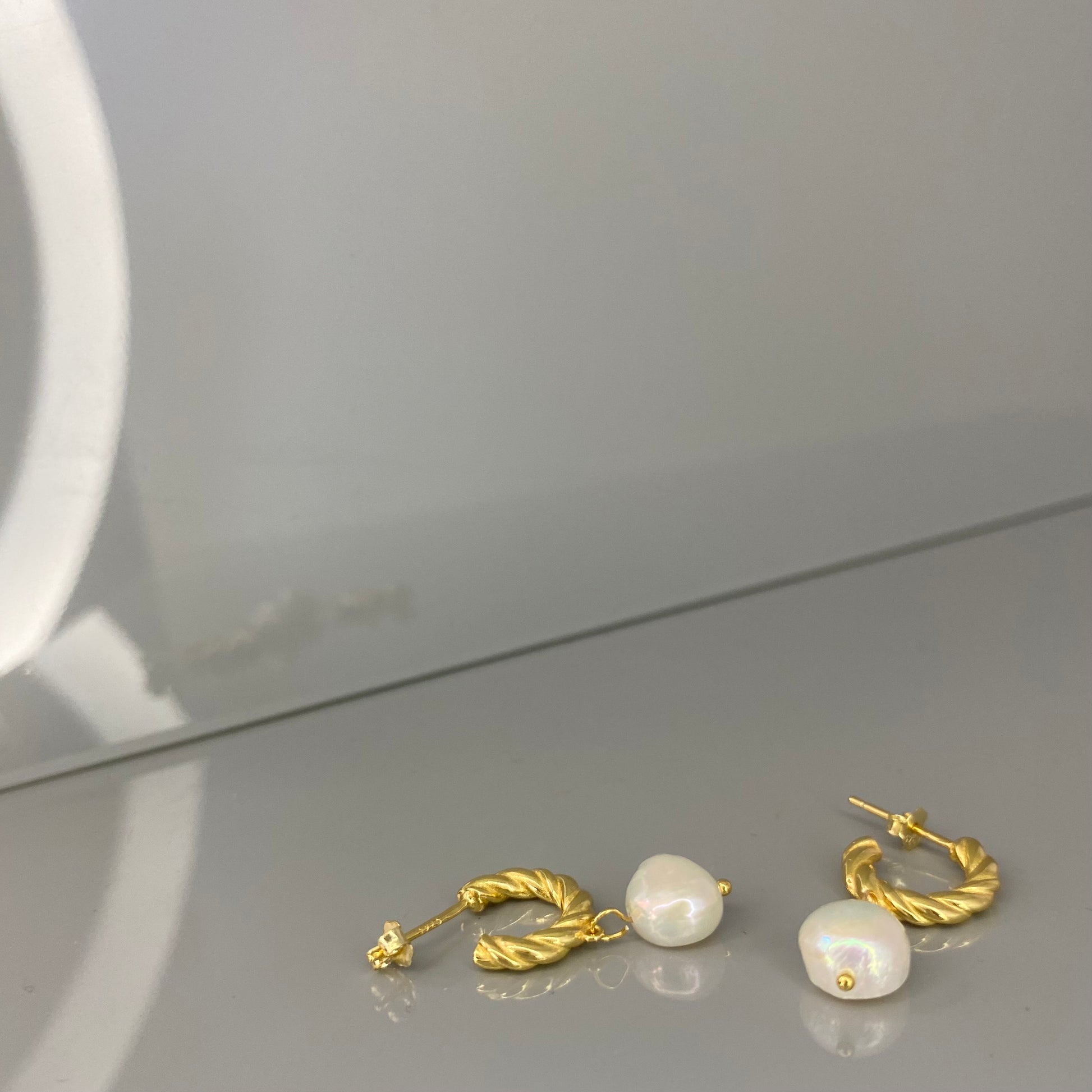 Sidabriniai auksuoti kabantys auskarai su perlu