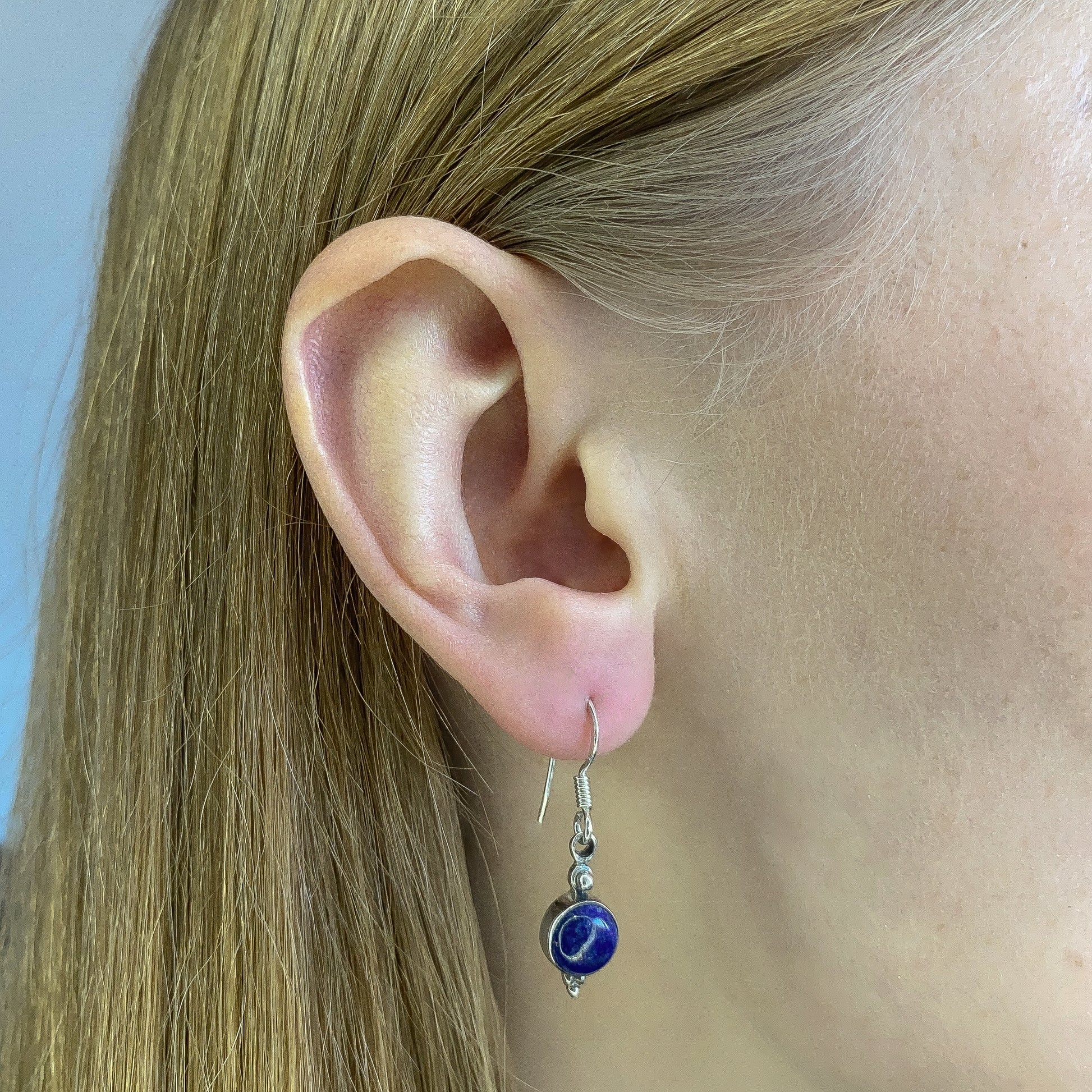 Sidabriniai kabantys auskarai su apvaliu lazurito akmeniu