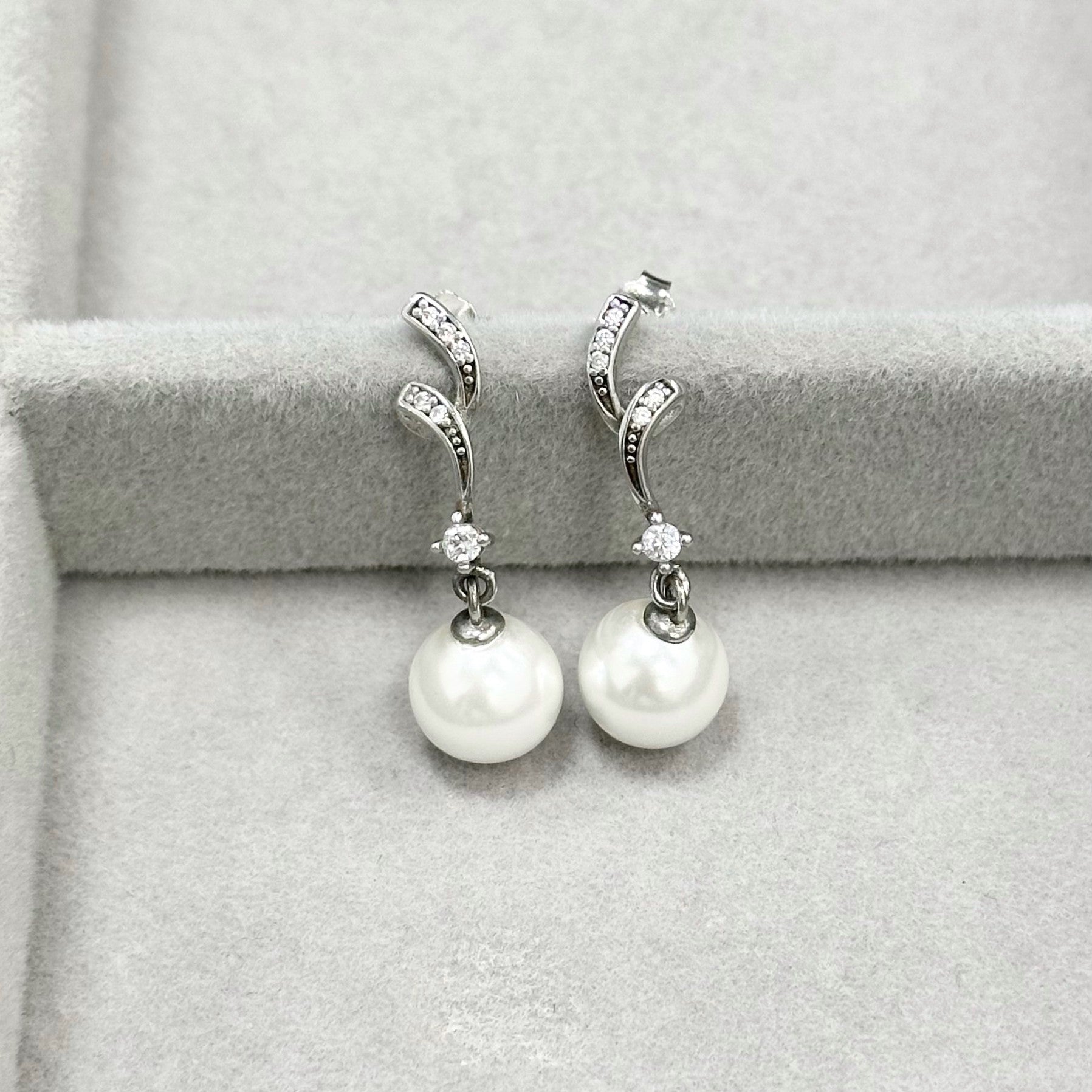 Sidabriniai rodžiuoti kabantys auskarai su cirkoniu ir perlu
