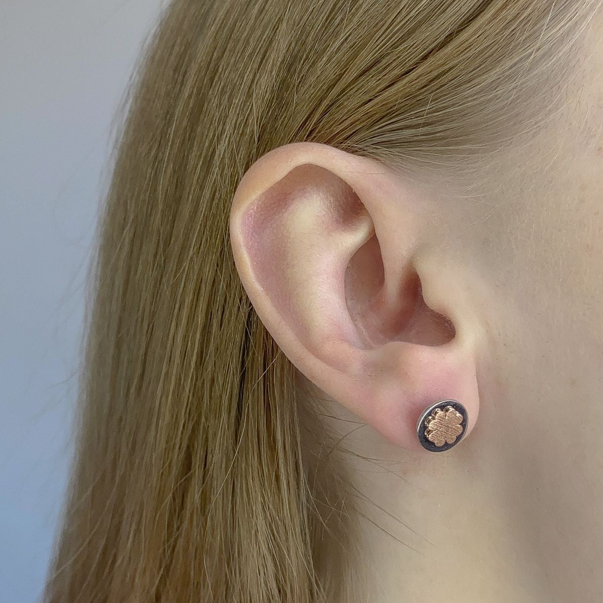 Auskarai dengti rodžiu (platinos grupės metalas). Dobilo padengimas: rausvu auksu.