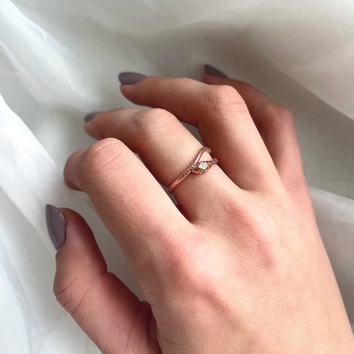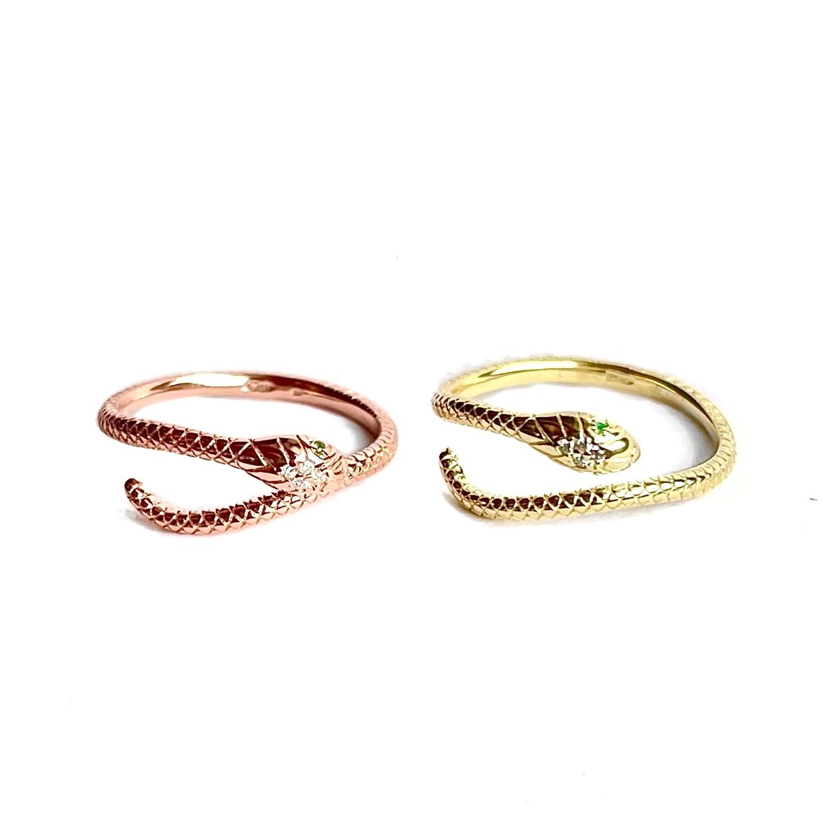 Gyvatėlės akyse inkrustuoti žali cirkoniai, galvoje - skaidrūs.
