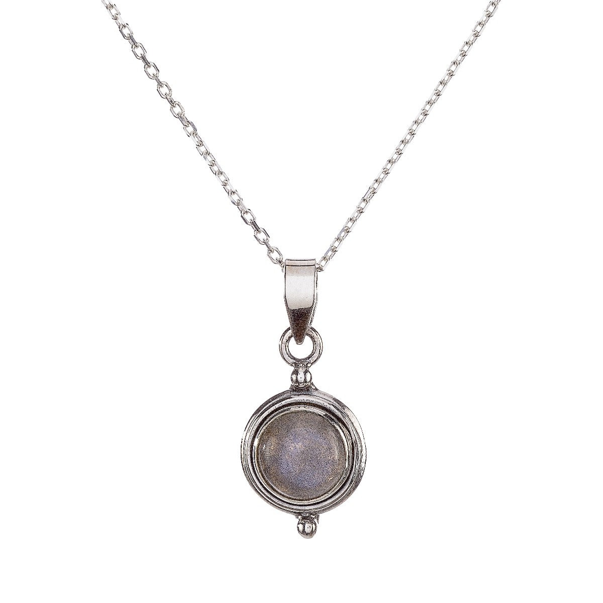 Sidabrinis pakabukas su apvaliu labradorito akmeniu ir grandinėle