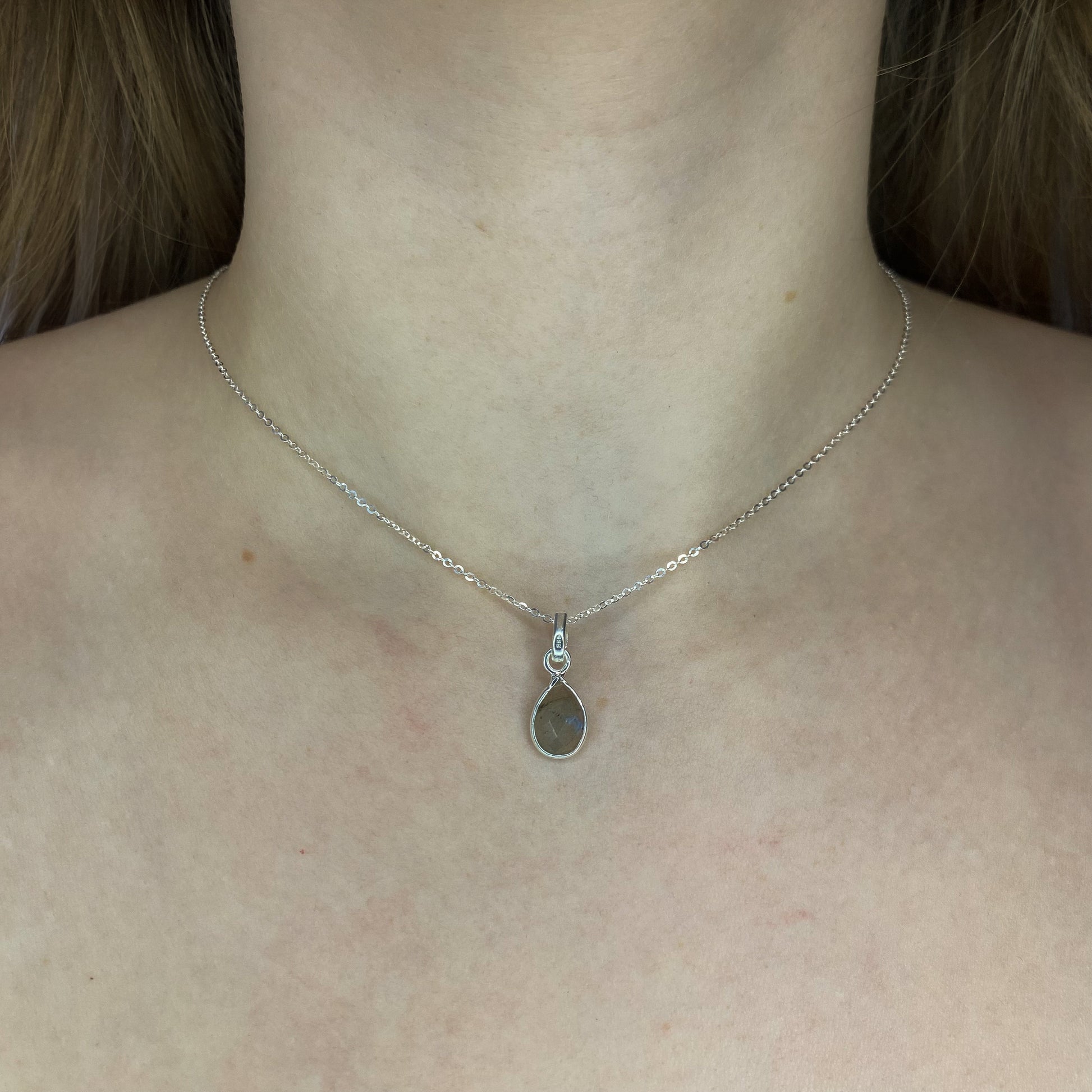 Sidabrinis pakabukas su lašo formos labradoritu ir grandinėle