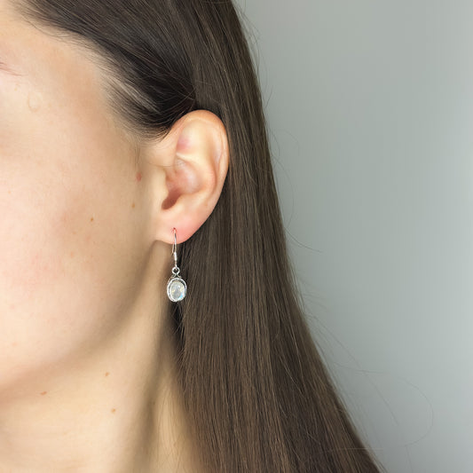 Sidabriniai kabantys auskarai su ovaliu mėnulio akmeniu
