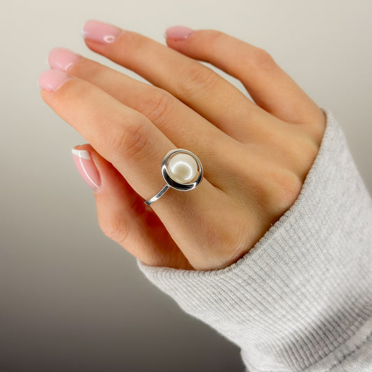 Sidabrinis rodžiuotas reguliuojamo dydžio žiedas su tikru perlu