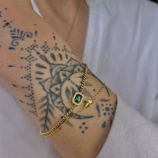 Sidabrinė auksuota apyrankė su žaliu stačiakampiu cirkoniu