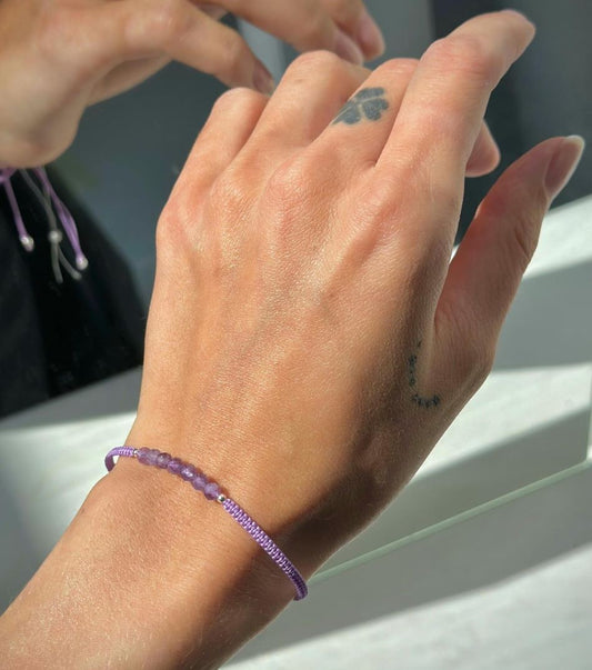 Siūlo apyrankė su sidabriniais karoliukais ir ametisto akmenukais