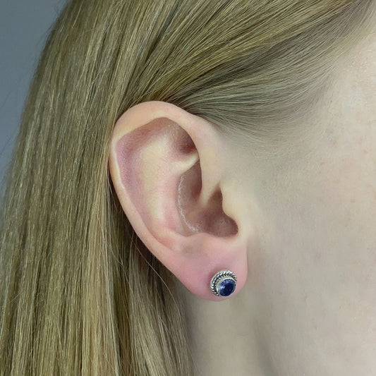 Sidabriniai apvalūs auskarai su labradorito akmeniu