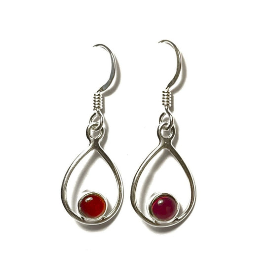 Sidabriniai rodžiuoti kabantys auskarai su raudonu cirkoniu