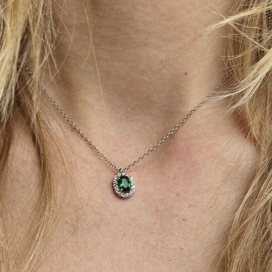 Sidabrinis rodžiuotas ovalus pakabukas su žaliu cirkoniu ir grandinėle