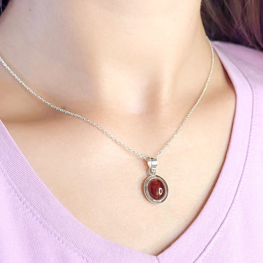 Sidabrinis pakabukas su ovaliu granato akmeniu ir grandinėle