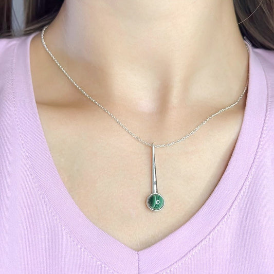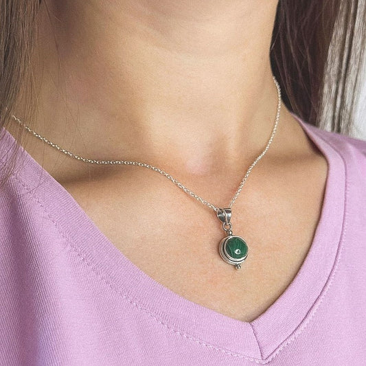 Sidabrinis pakabukas su apvaliu malachitu ir grandinėle