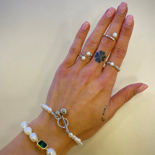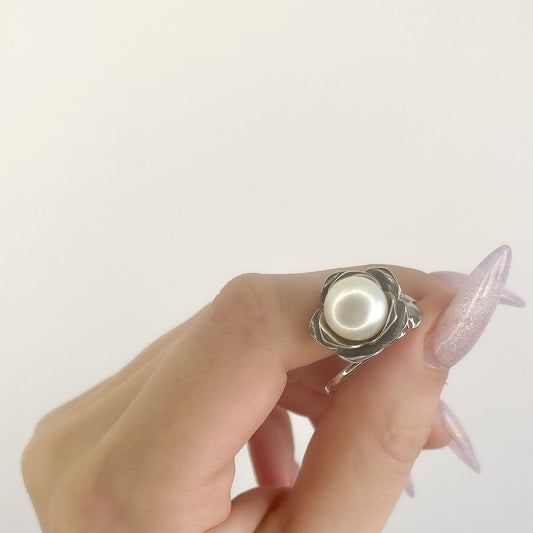 Sidabrinis rodžiuotas reguliuojamo dydžio žiedas „Gėlytė“ su tikru perlu