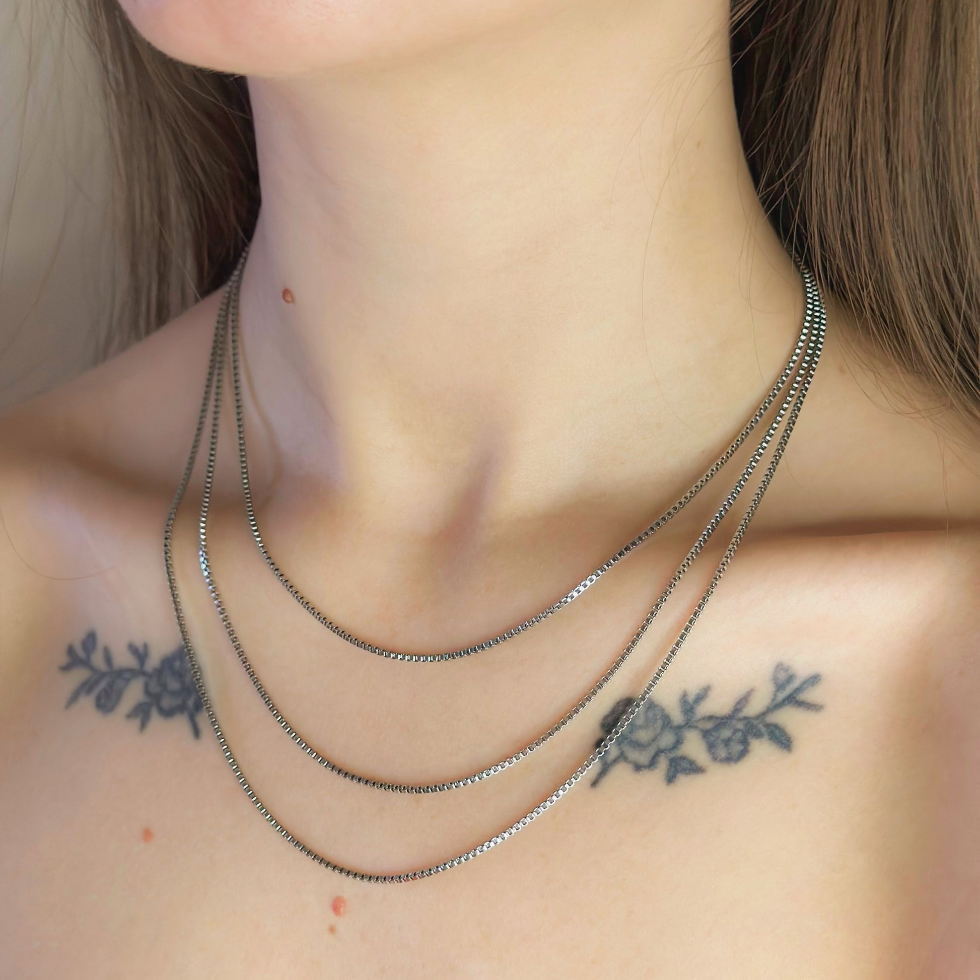 Trys skirtingo ilgio sujungtos grandinėlės sukuria stilingą sluoksniuotą efektą.