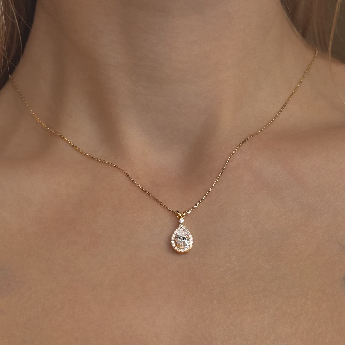 Auksuotas sidabrinis lašo formos pakabukas su cirkoniu ir grandinėle