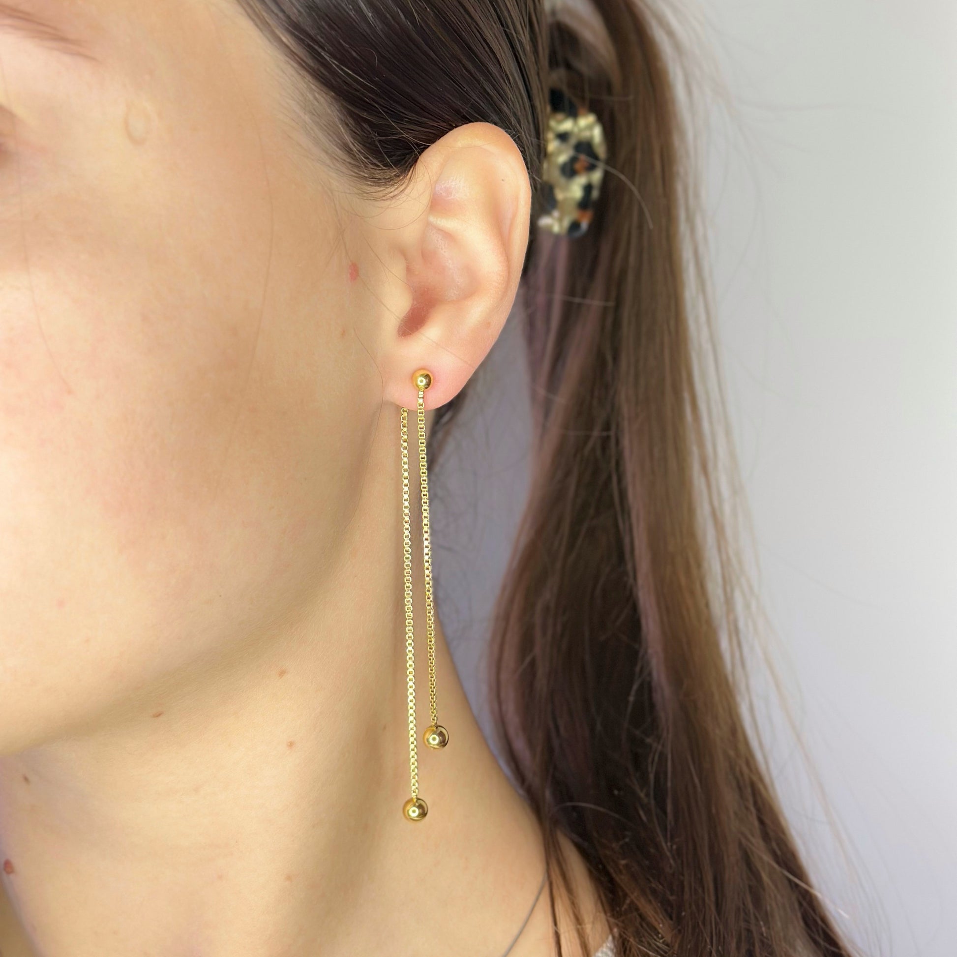 Auksuoti kabantys auskarai su grandinėle