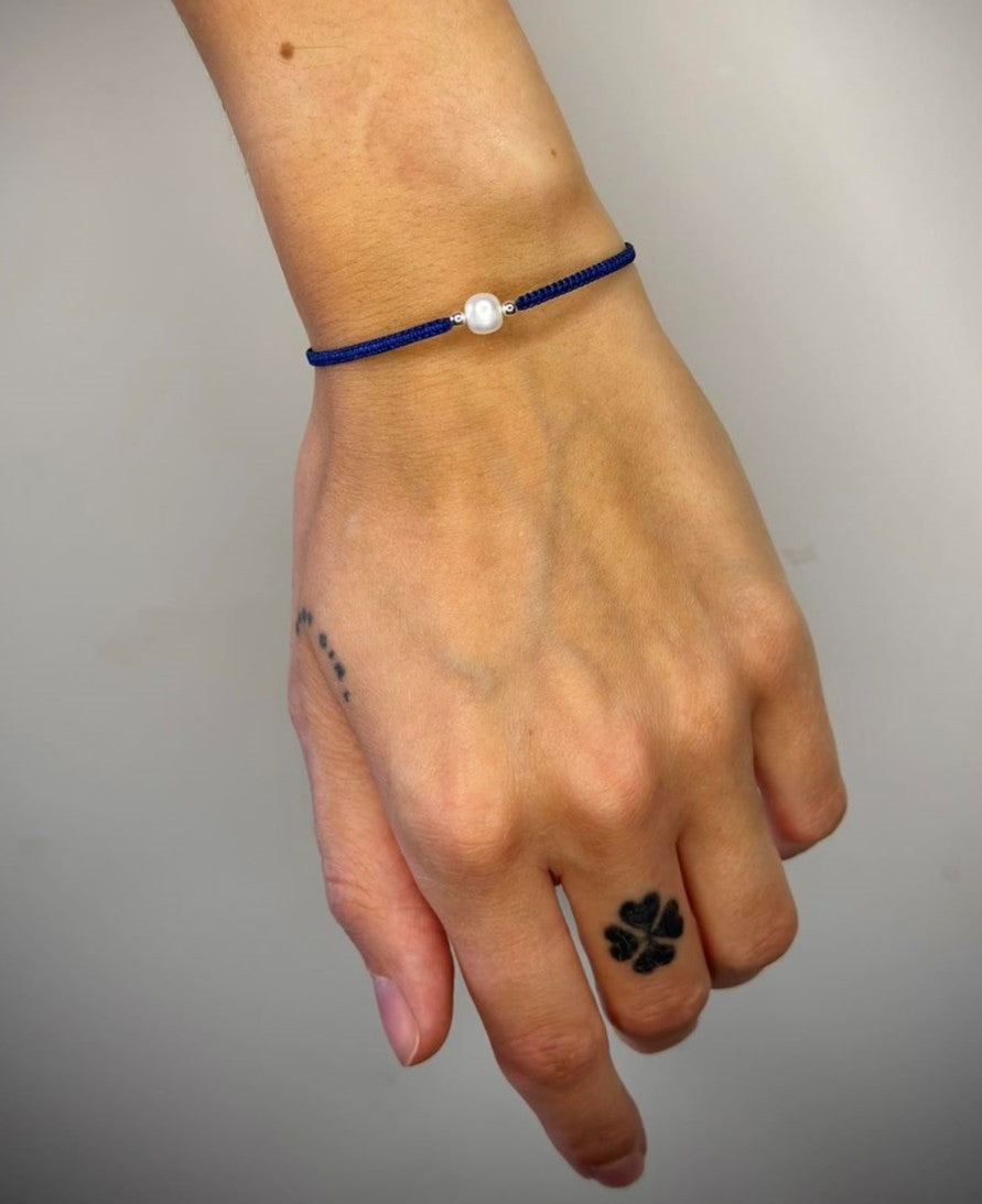 Įvairių spalvų siūlo apyrankės su tikru perlu ir sidabriniais karoliukais