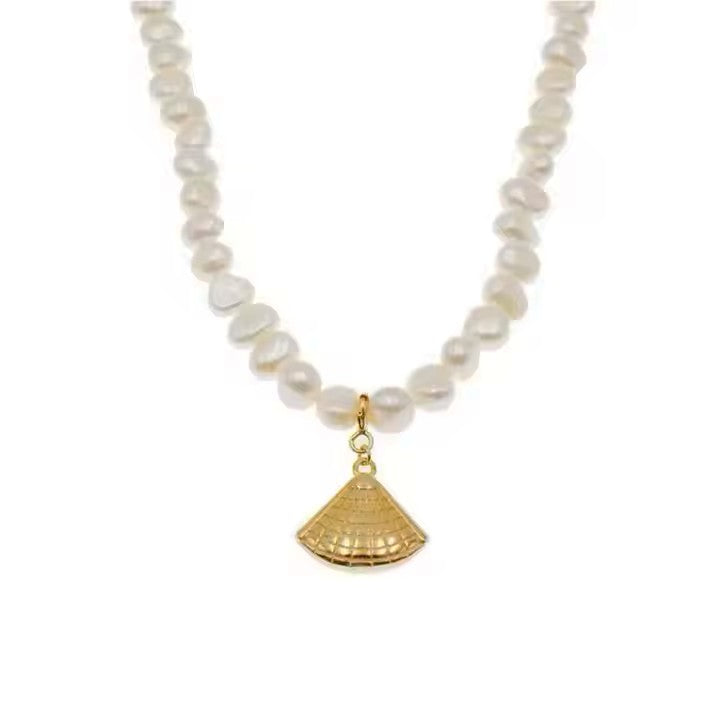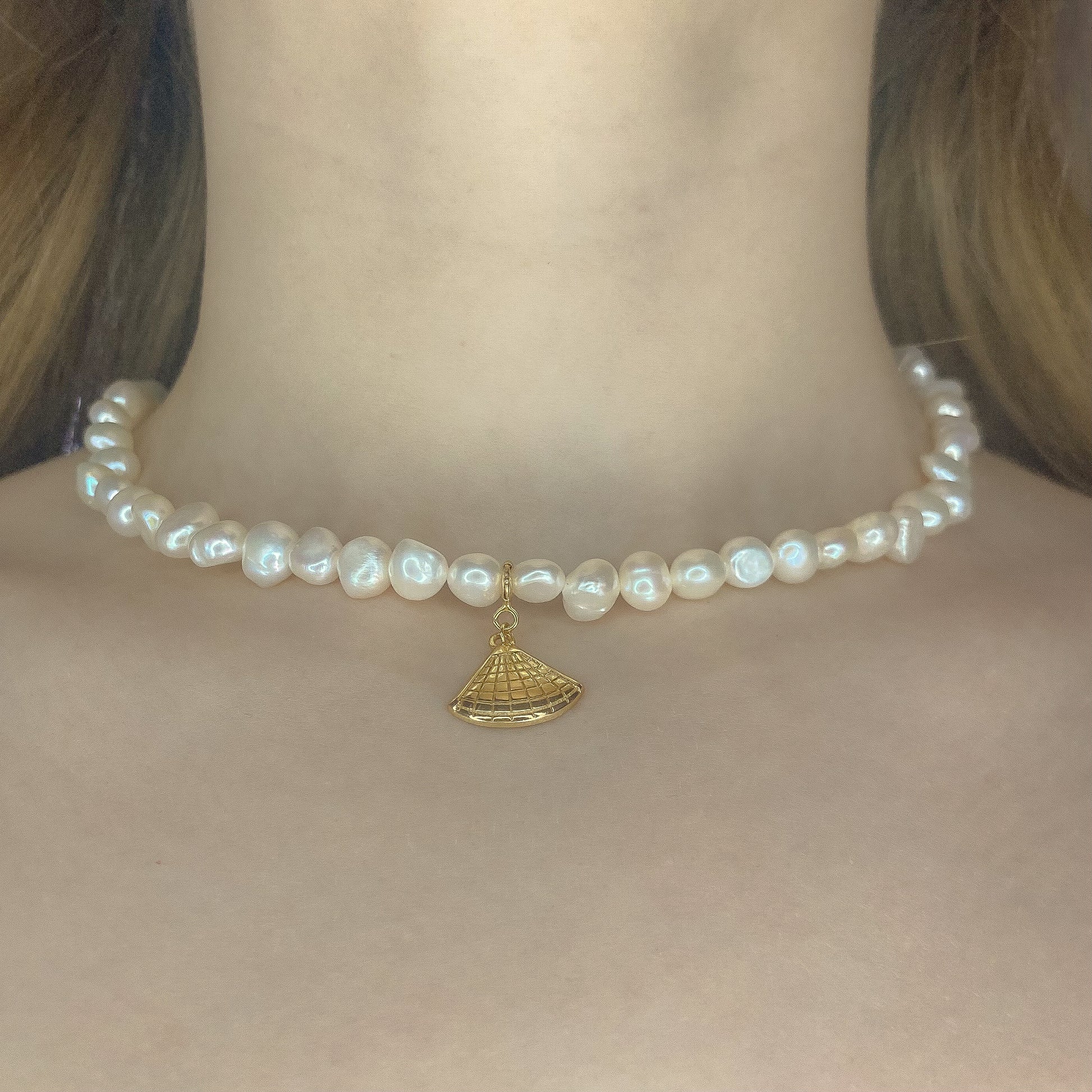 Perlų vėrinys su sidabrine auksuota jūros kriaukle