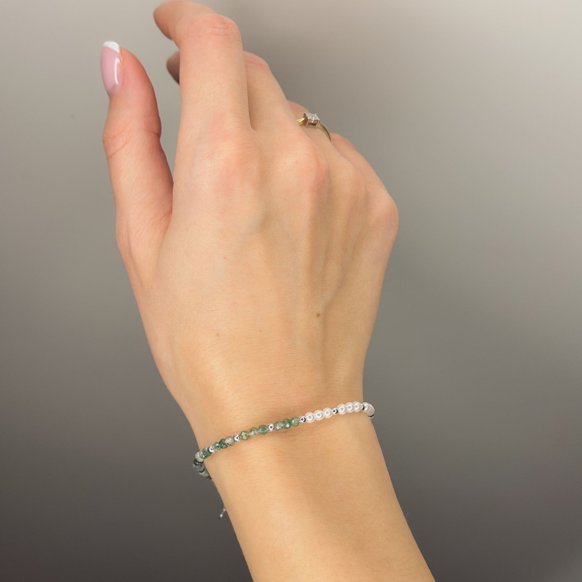 Apyrankė dekoruota 3 mm netikrais perlais ir natūraliais akmenimis.