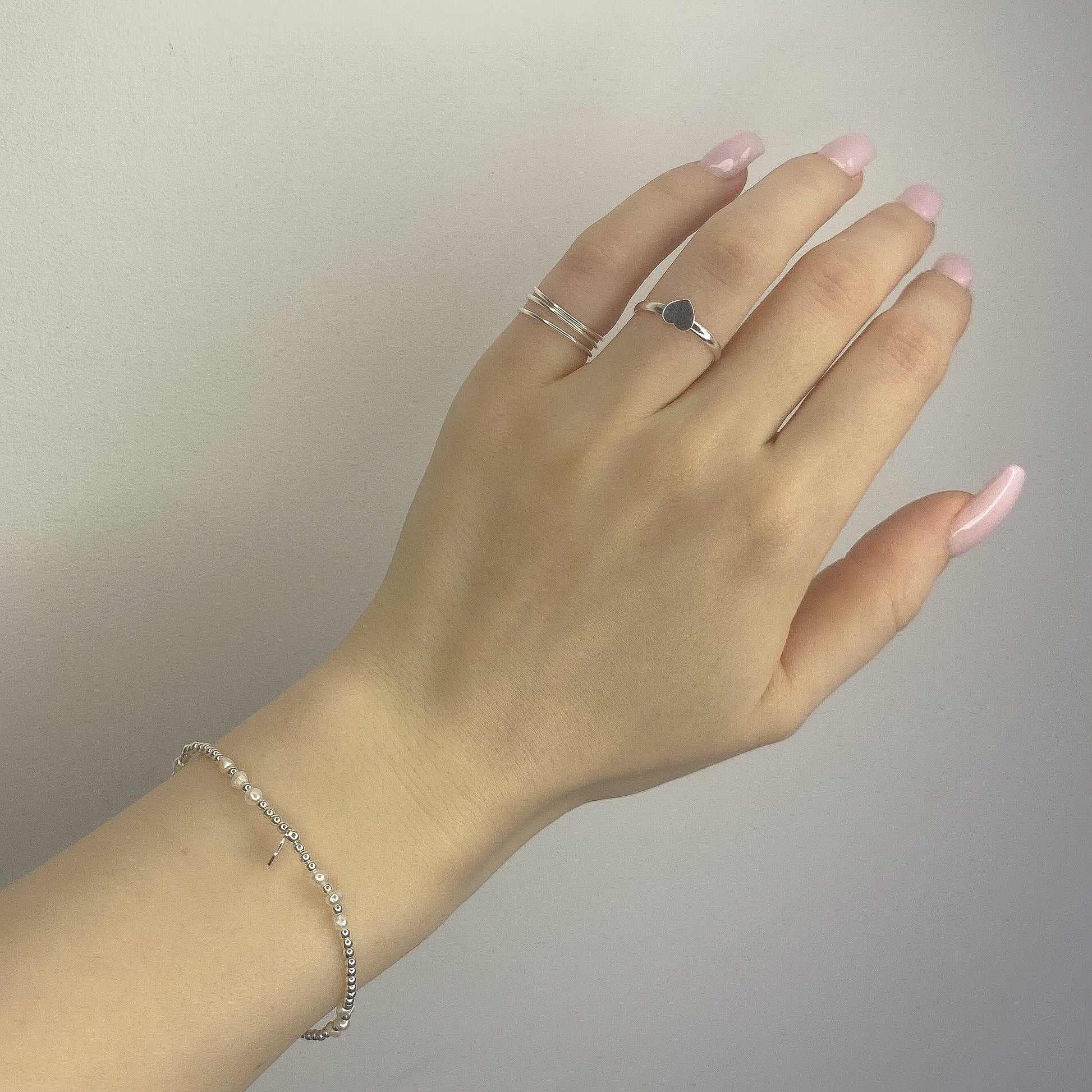 Apyrankė iš sidabro karoliukų ir perliukų suverta ant tampriosa virvelės.
