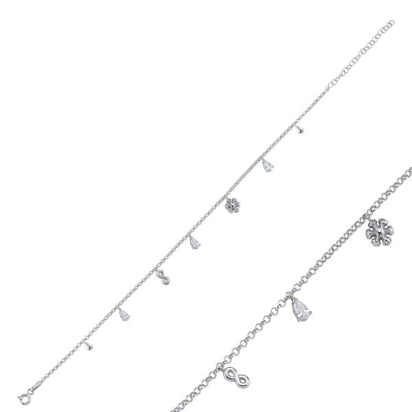 Sidabrinė rodžiuota grandinėlė ant kojos su gėlyte ir begalybe