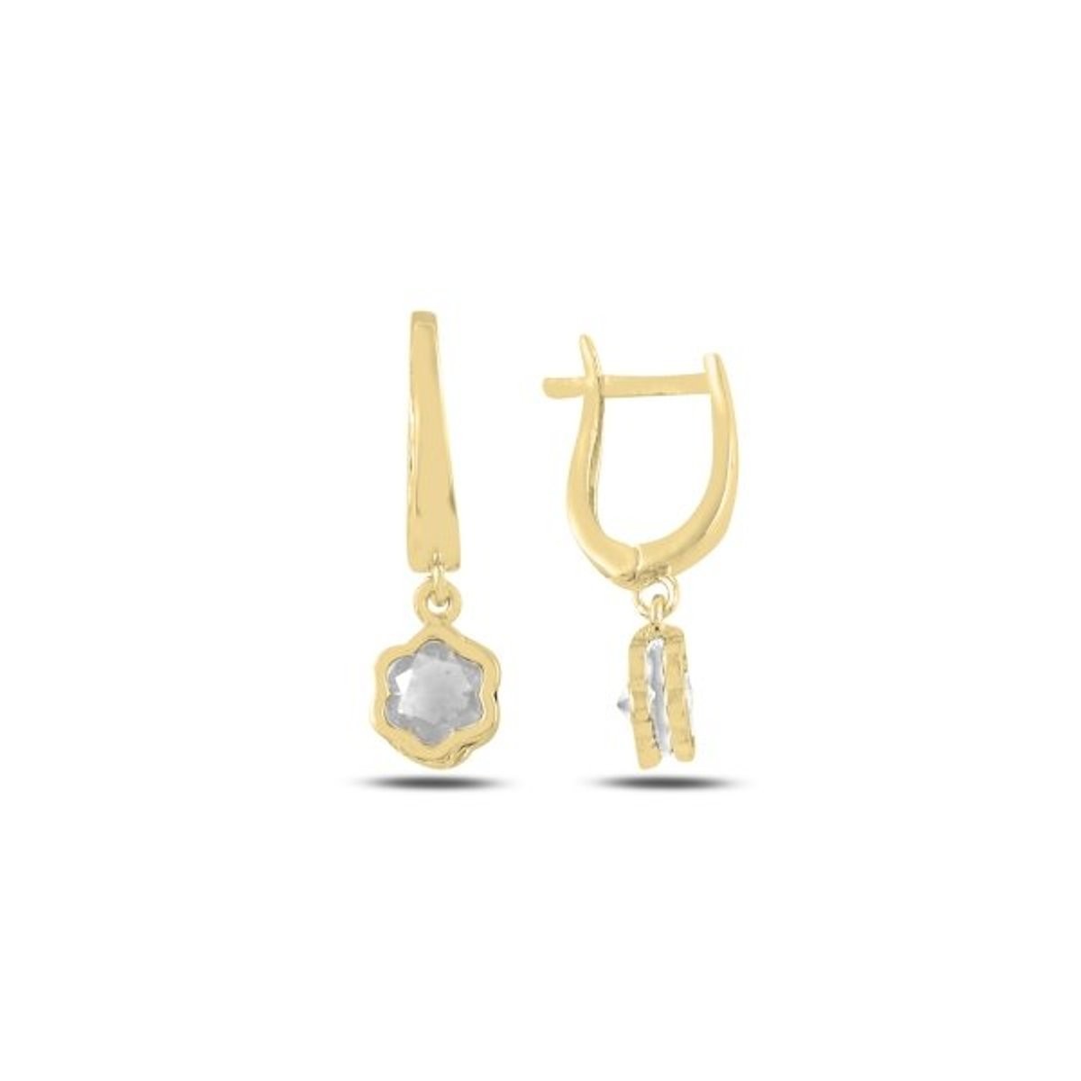 Sidabriniai auksuoti kabantys auskarai angl. užsegimu ir cirkonio gėlyte
