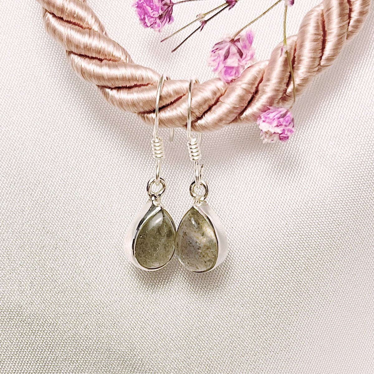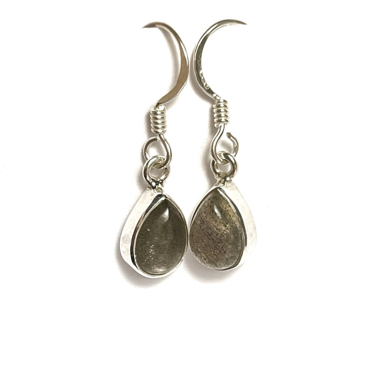 Sidabriniai kabantys lašo formos auskarai su labradoritu