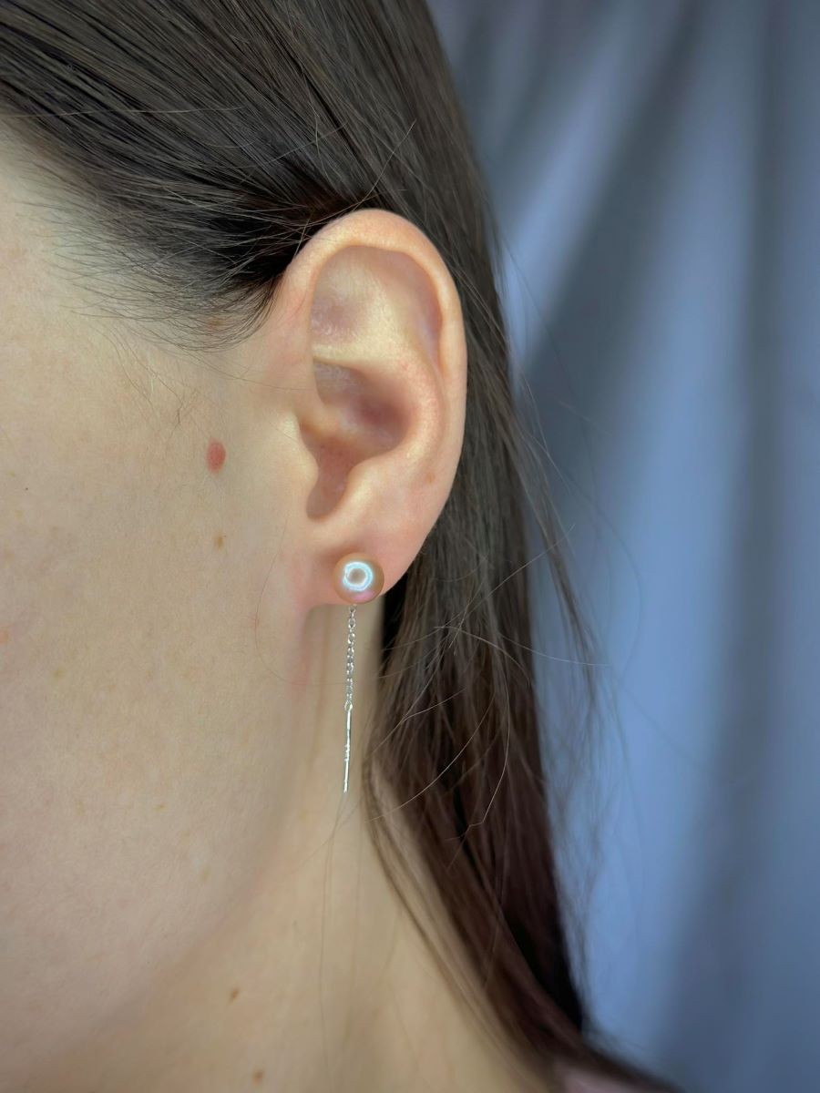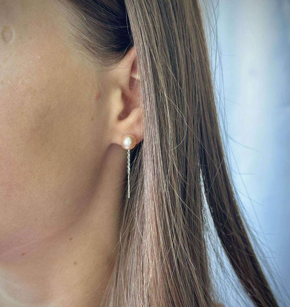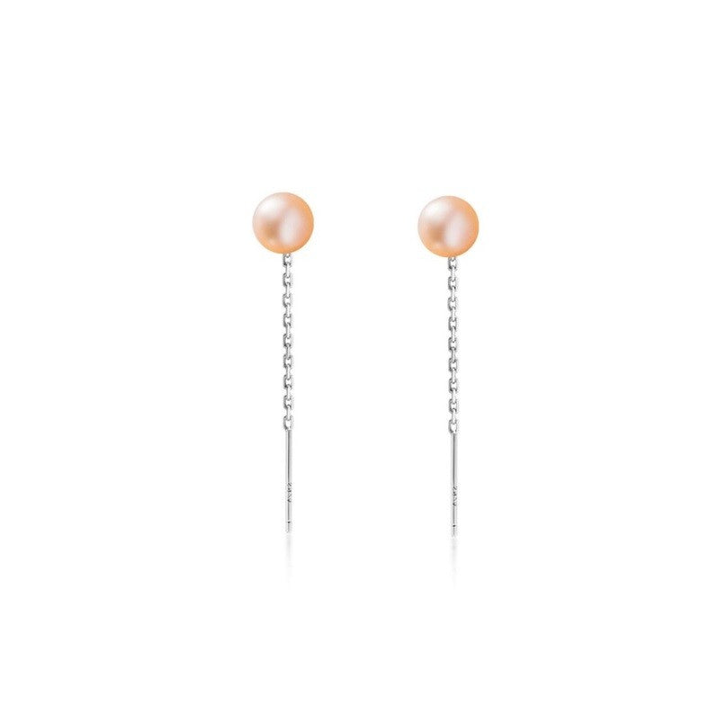 Sidabriniai kabantys rodžiuoti auskarai su grandinėle ir tikru perlu
