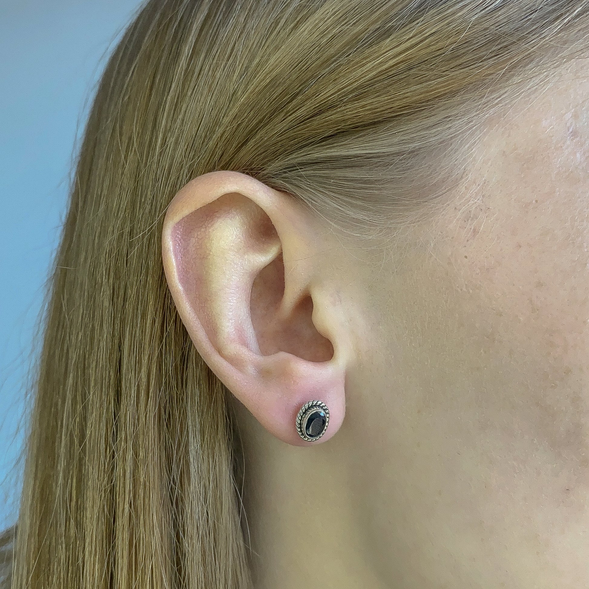 Sidabriniai ovalios formos auskarai su onikso akmeniu