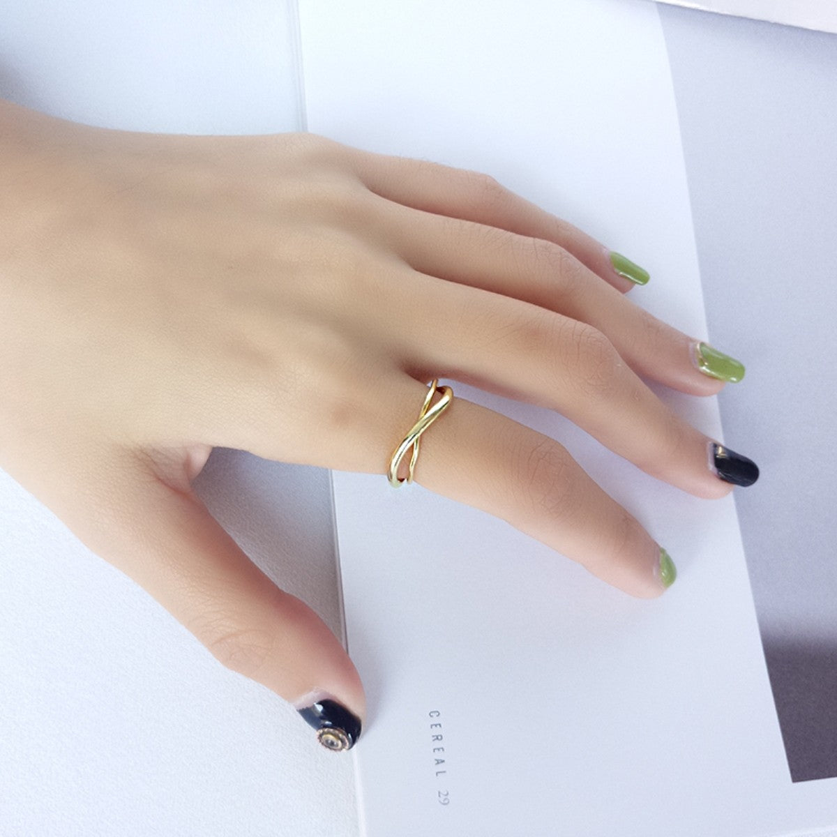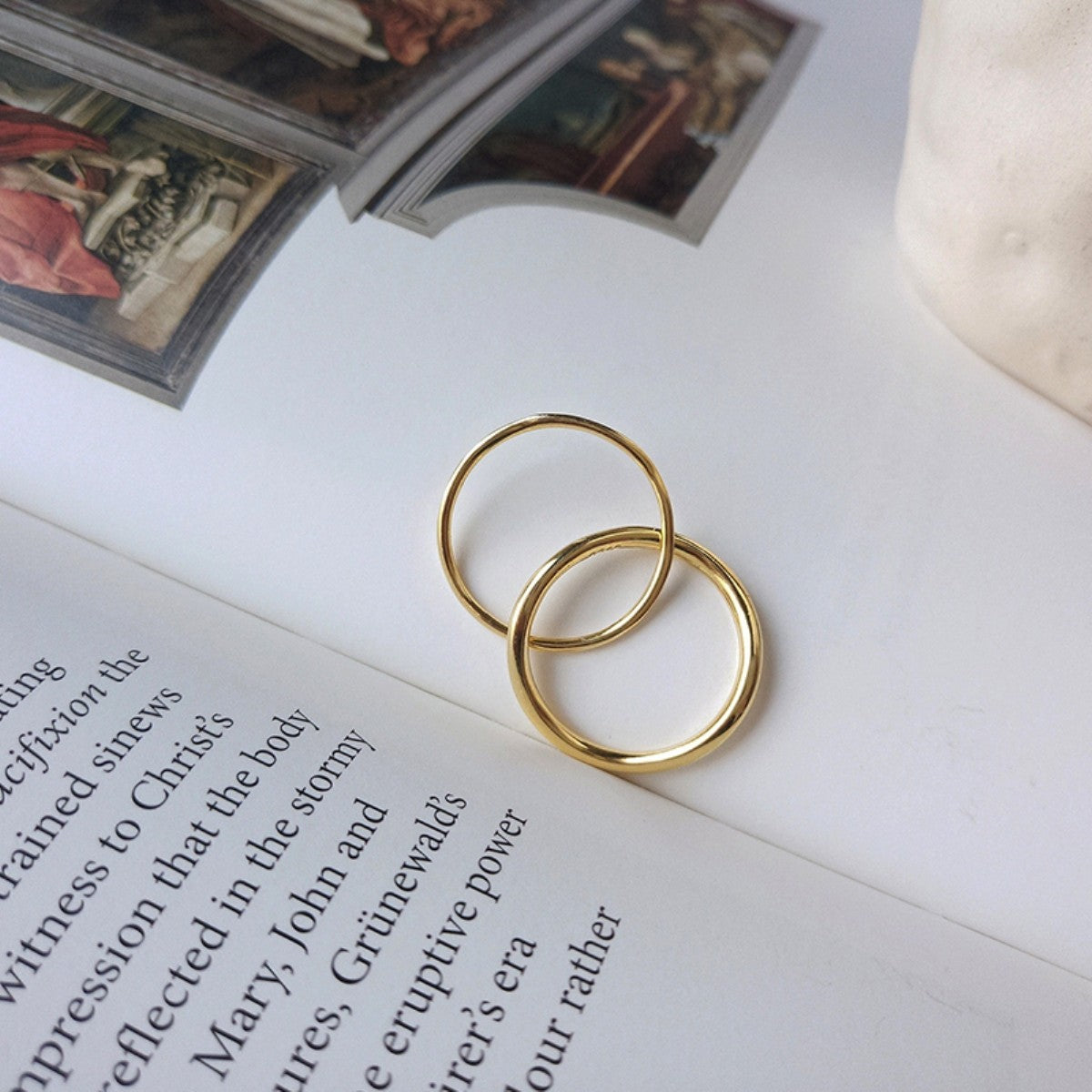 Žiedas padengtas geltonu auksu, sujungtas, iš 2 dalių.