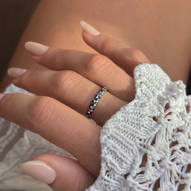 Sidabrinis paauksuotas žiedas su 3 eilėmis spalvotų cirkonių