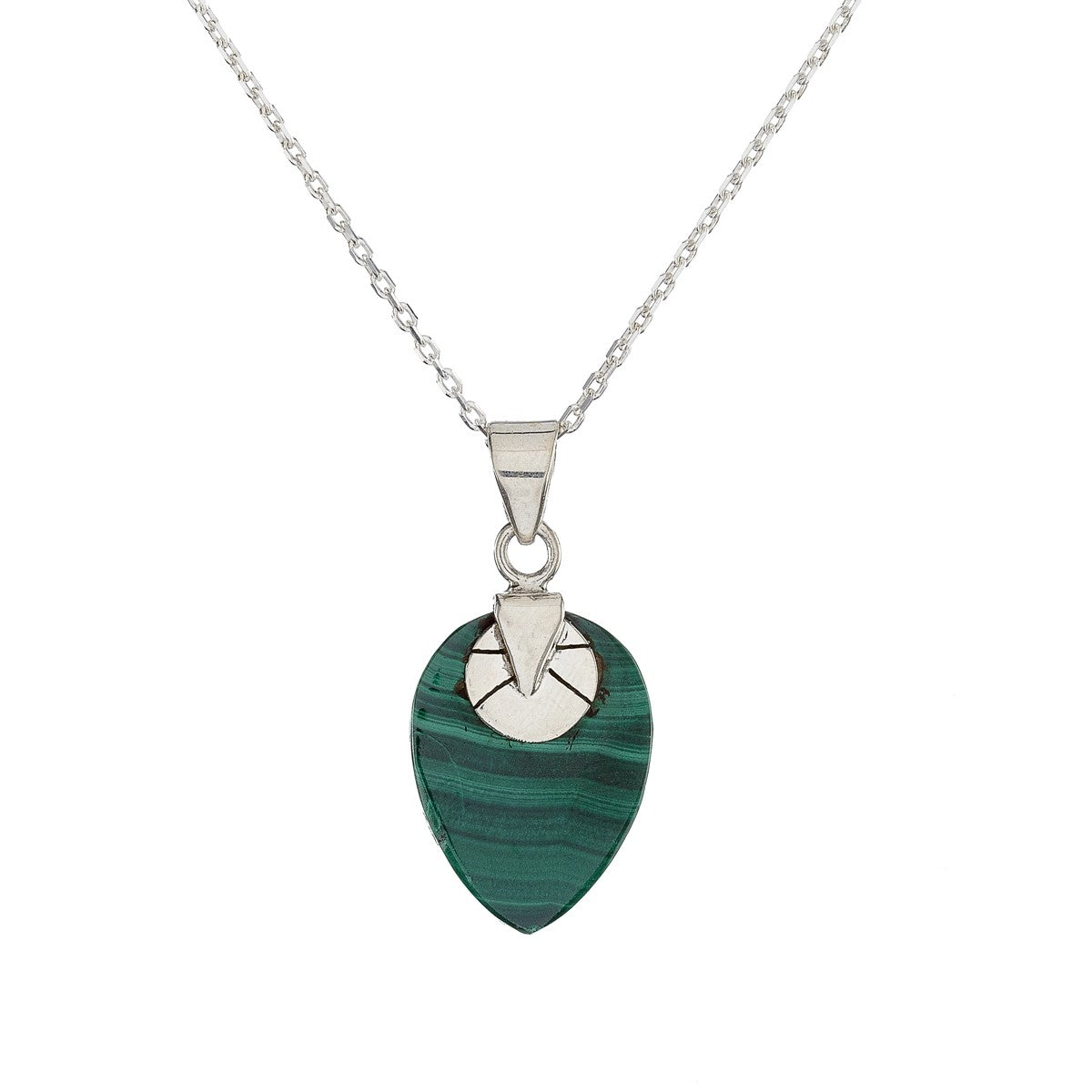 Sidabrinis pakabukas su malachito akmeniu ir grandinėle