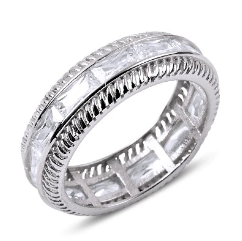 Sidabrinis rodžiuotas 7 mm pločio žiedas su stačiakampiais kristalais