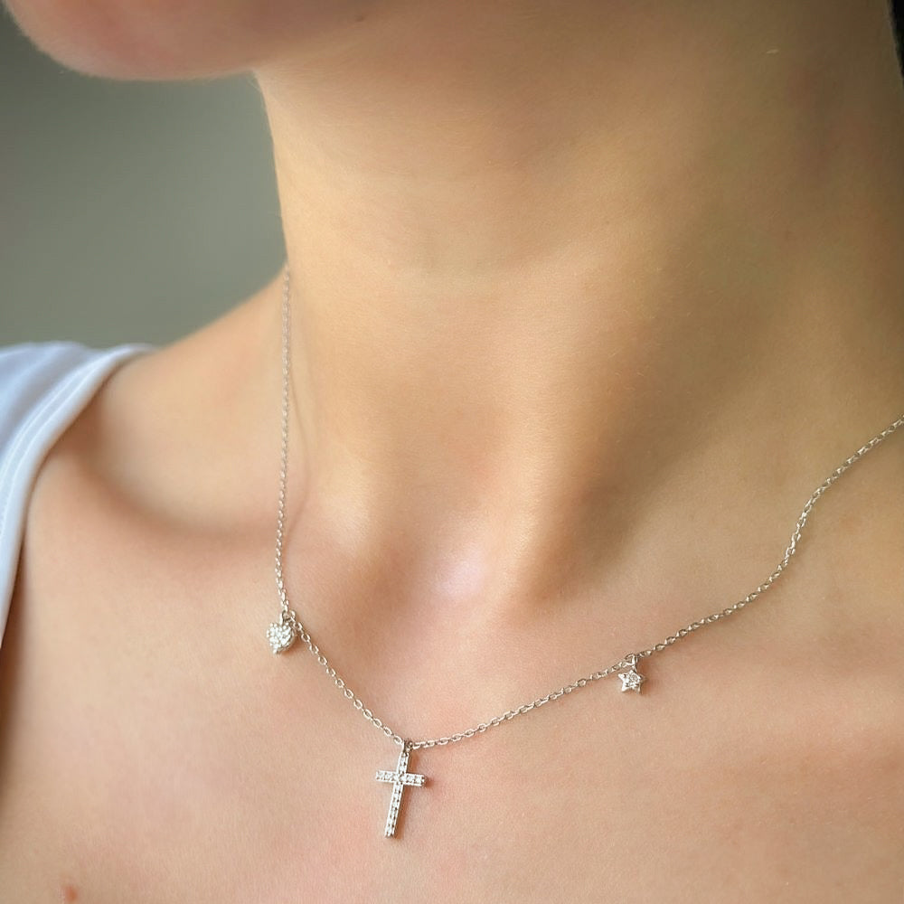 Sidabrinis rodžiuotas kryželis su cirkoniais ir grandinėle
