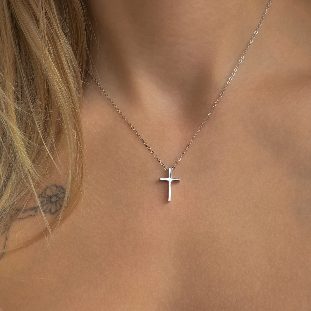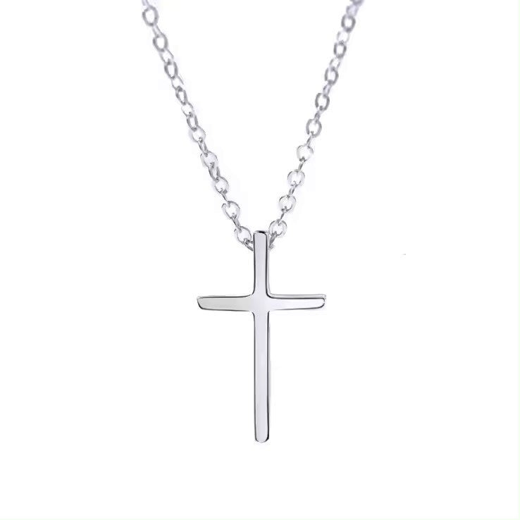 Sidabrinis kryželis su sidabrine grandinėle, dengti rodžiu.
