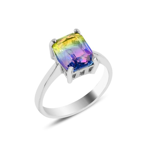 Sidabrinis rodžiuotas žiedas su spalvotu stačiakampiu akmeniu