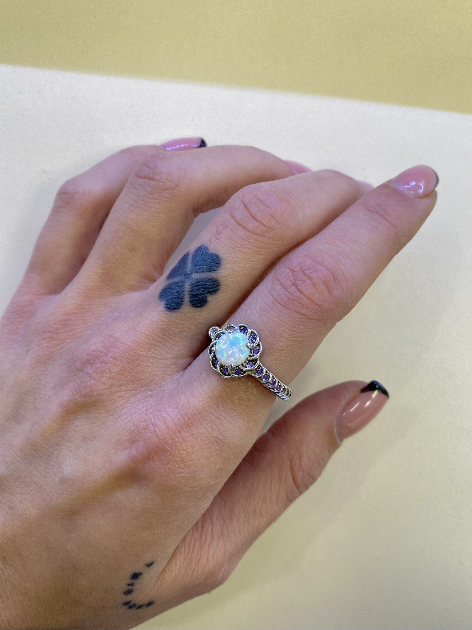 Akmuo: sintetinis opalas ir alyviniai cirkoniai.
